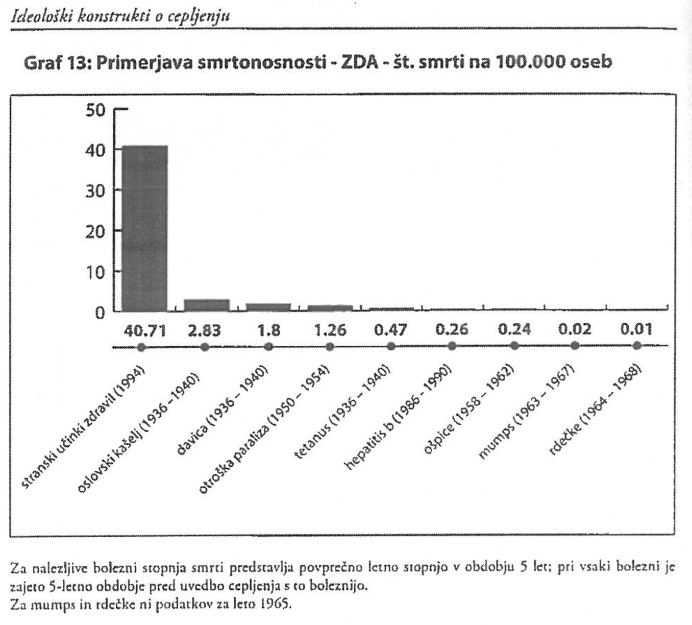 "Aydin in sodelavci (2010) poročajo o primeru 6-mesečnega fantka ... Shaffer in sodelavci (2015) poročajo o predhodno zdravi petnajstletnici ... Ozawa in sodelavci (2000) poročajo ... Lazarou in sodelavci (1008) so izvedli metaanalizo stranskih učinkov zdravil … če zgornje podatke združimo s št. prebivalcev ter s podatki o umrljivosti zaradi posameznih nalezljivih bolezni , dobimo dokaj zanimivo sliko (glej Tabela 10 in Graf 13). Podatki govorijo sami zase. Stranski učinki zdravil so v letu 1994 terjali 32-krat več življenj kot otroška paraliza v obdobju pred cepljenjem, 169-krat več življenj kot ošpice v obdobju pred cepljenjem in kar 4.000-krat več življenj kot rdečke v obdobju pred cepljenjem." (strani 155-163, 117-118)