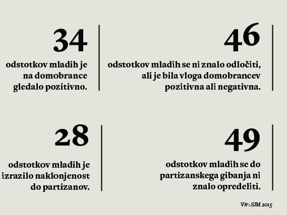 Da je poznavanje temeljnih pojmov iz polpretekle zgodovine med mladimi vedno slabše, je pokazala tudi raziskava Slovensko javno mnenje iz leta 2015. Skoraj polovica anketirancev pod tridesetim letom starosti namreč ni imela pojma, kaj bi odgovorila, ko so raziskovalci vprašali po odnosu do slovenskih partizanov. Odločili so se, da zanje partizani nimajo ne dobre in ne slabe konotacije. Obenem je raziskava pokazala na nedvoumno povezavo med starostjo in naklonjenostjo do domobranstva. »Starejši ko so anketiranci, negativnejši odnos imajo do pojma slovensko domobranstvo in bolj so naklonjeni partizanskemu gibanju. Obratno je pri mladih, med katerim je odstotek tistih, ki so domobranstvo ocenili zelo pozitivno, najvišji med vsemi starostnimi skupinami,« nam je pojasnila Živa Broder iz Centra za raziskovanje javnega mnenja.