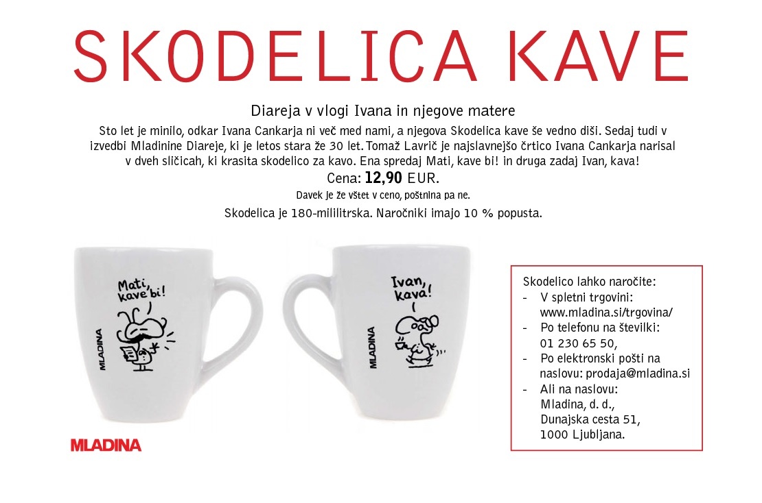 Sto let je minilo, odkar Ivana Cankarja ni več med nami, a njegova Skodelica kave še vedno diši. Sedaj tudi v izvedbi Mladinine Diareje, ki je letos stara že 30 let. Tomaž Lavrič je najslavnejšo črtico Ivana Cankarja narisal v dveh sličicah, ki krasita skodelico za kavo. Ena spredaj Mati, kave bi! in druga zadaj Ivan, kava!