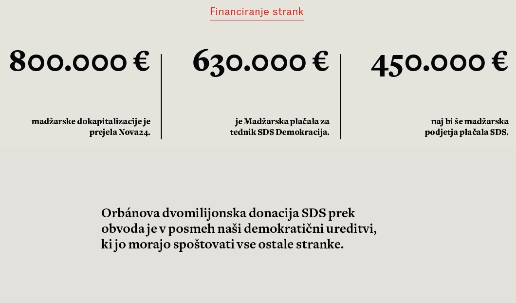 Skoraj dva milijona evrov predvolilne pomoči stranki SDS, ki je takoj razširila svojo propagando z ustanovitvijo novega tednika Škandal in 13 lokalnih portalov, pomeni za neko slovensko stranko zelo velik kapital. Lani je SDS s članarinami nabrala 106 tisoč evrov, iz državnega proračuna je stranka dobila pol milijona evrov in še 430 tisoč evrov iz proračunov občin. Lani so fizične osebe – predvsem evroposlanci iz SDS –, stranki donirali 10.590 evrov. Konkurenti SDS, Socialni demokrati, so lani iz proračuna prejeli 475 tisoč evrov, s članarinami pa so zbrali 97 tisoč evrov. Dva milijona evrov je toliko prihodkov, kot sta jih imeli lani SDS in SD skupaj. Poslovanje strank je po zakonu o političnih strankah strogo nadzorovano, saj se z njihovim javnim financiranjem zagotavljata neodvisnost in preglednost delovanja. Donacije političnim strankam so zato omejene, politične stranke so omejene pri najemanju kreditov in tako naprej. Orbánova donacija SDS prek obvoda je v posmeh tej demokratični ureditvi, ki jo morajo spoštovati vse preostale stranke.