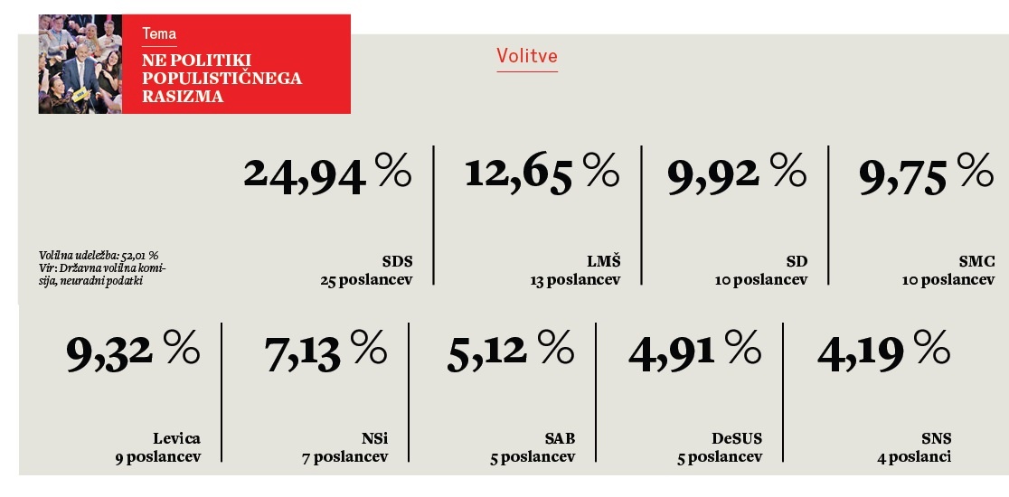 Volilna statistika je pravzaprav neizprosna: stranke, ki so pred volitvami nasprotovale Janezu Janši, so skupno zbrale 343 tisoč glasov, SDS in NSi pa 282 tisoč. V poslanskih sedežih to pomeni 52 proti 32. Ali kot so suho sporočili iz Valicona: »T. i. levi pol (Levica, SD, SMC, LMŠ, SAB) je dobil višjo podporo od t. i. desnega pola (SDS, NSI, SLS) v 67 od 88 volilnih okrajev (75 %) ter v vseh volilnih enotah, razen v volilni enoti Ptuj.« SDS je morda dobila več glasov, a razdrobljene stranke, ki so stranki nasprotovale, so ga premagale. Pri čemer to ne pomeni, da so lahko kar zadovoljne, od vseh strank vlade v odhajanju je napredovala le najmanjša, Židanova SD.