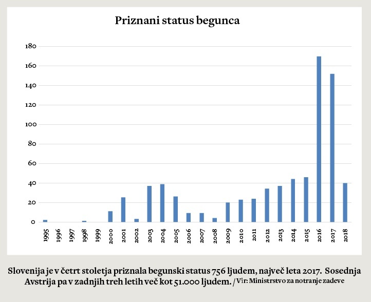 Poleg tega na policiji med ilegalne prehode meje štejejo tudi okoli 360 tisoč ljudi, ki so Slovenijo v nekaj tednih prečkali v času vrhunca begunske krize leta 2015. Skoraj vsi ti »ilegalni migranti« so Slovenijo zgolj prečkali. V Sloveniji je namreč v četrt stoletja prošnjo za azil vložilo vsega skupaj nekaj manj kot 12 tisoč ljudi. Da, 12 tisoč v četrt stoletja. Od tega je država priznala begunski status le šestim odstotkom oziroma točno 756 ljudem. Da, nekaj sto ljudem. Ti so postali del v Sloveniji živečih tujcev, tujcev, ki tu bivajo na podlagi takšne ali drugačne pravne podlage. Skupaj jih je nekaj več kot 120 tisoč – enkrat več kot pred desetimi leti, a v celotni masi prebivalstva Slovenije ta številka pomeni le šest odstotkov. Avstrija je recimo zgolj v zadnjih treh letih – 2015, 2016 in 2017 – priznala begunski status več kot 51 tisoč ljudem.