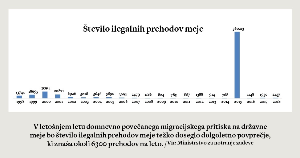 Tudi če izvzamemo nekoliko bolj nenavaden dogodek iz leta 2015, ko je državo v nekoliko organiziranem konvoju »ilegalno« prečkalo 360 tisoč ljudi, bo letošnje število ilegalnih prehodov meje verjetno nižje od povprečja zadnjih dvajsetih let. Povprečno je policija v zadnjih dveh desetletjih na leto zaznala okoli 6300 ilegalnih prehodov meje. V prvih petih mesecih letošnjega leta je zaznala 2437 ilegalnih prestopov meje.