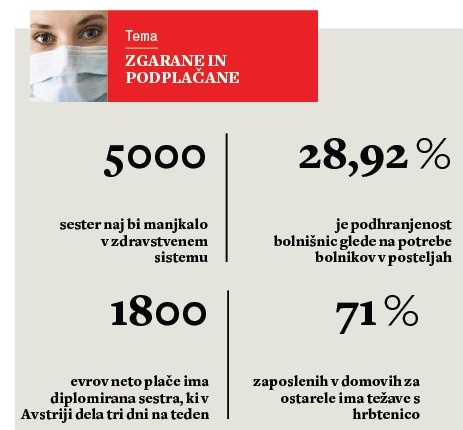 Njene besede potrdi sestra Karla Pisanec, ki dela v informacijski pisarni travmatološkega oddelka; v bolnišnici je že 35 let. »Ko sem začenjala, so na oddelku prevladovali manj zahtevni pacienti kot sedaj. Manj je bilo tudi papirologije, danes je tega ogromno, sicer te lahko hitro tožijo. Predvsem pa nas je bilo več in bile smo solidno plačane.« Ko je bila mlada medicinska sestra, je bila ponosna na svoj poklic, še pove. Ko se je kasneje za isto pot odločila hči, so ji znanci očitali, zakaj je ni usmerila drugam. »Tem dekletom sedaj res ni lahko. Ne dobijo služb za nedoločen čas, ne izplačujejo jim nadur, nobenih možnosti nimajo, da bi dobile posojilo, si ustvarile dom ... Obenem garajo po vse dneve, za nameček pacienti stresajo nanje svoje frustracije, one pa morajo biti prijazne in nasmejane.«