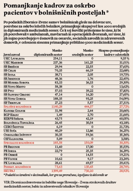 Niti v drugih zdravstvenih zavodih po državi ni nič bolje. Podatki, ki jih zbira Zbornica zdravstvene in babiške nege Slovenije-Zveza strokovnih društev medicinskih sester, babic in zdravstvenih tehnikov Slovenije, kažejo, da v splošnih bolnišnicah skupaj primanjkuje 1585 zaposlenih iz teh profilov; povprečna stopnja kadrovske podhranjenosti splošnih bolnišnic znaša skoraj 28 odstotkov. Po teh podatkih potrebuje ljubljanski klinični center še vsaj 254 dodatnih diplomiranih medicinskih sester, mariborski pa 238 in še 161 srednjih. Najhuje je v Novi Gorici, kjer bi potrebovali še vsaj enkrat toliko medicinskih sester, kot jih že imajo. Če tem številkam prištejemo še podatke za specialne in psihiatrične bolnišnice, pridemo do podatka o 2130 sestrah, ki jih skupaj primanjkuje po oddelkih slovenskih bolnišnic.