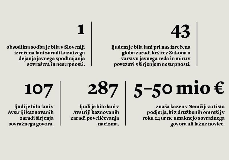 Nekje pa je treba potegniti črto. Zgornji primeri so dokaz. Svoboda posameznika je vedno omejena s svobodo drugega. Pri čemer nimamo v mislih osebnih žalitev, klevetanj, posegov v dostojanstvo, za kar lahko posameznik v zasebni tožbi poišče pravico na sodišču. Črto je pri tem vprašanju potegnila država. Slovenski kazenski zakonik jasno prepoveduje spodbujanje sovraštva, nasilja ali nestrpnosti. V Sloveniji se tisti, prav je, da zakonski člen zapišemo v celoti, ki »spodbuja ali razpihuje sovraštvo, nasilje ali nestrpnost, ki temelji na narodnostni, rasni, verski ali etnični pripadnosti, spolu, barvi kože, poreklu, premoženjskem stanju, izobrazbi, družbenem položaju, političnem ali drugem prepričanju, invalidnosti, spolni usmerjenosti ali katerikoli drugi osebni okoliščini, in je dejanje storjeno na način, ki lahko ogrozi ali moti javni red in mir, ali z uporabo grožnje, zmerjanja ali žalitev, kaznuje z zaporom do dveh let«.