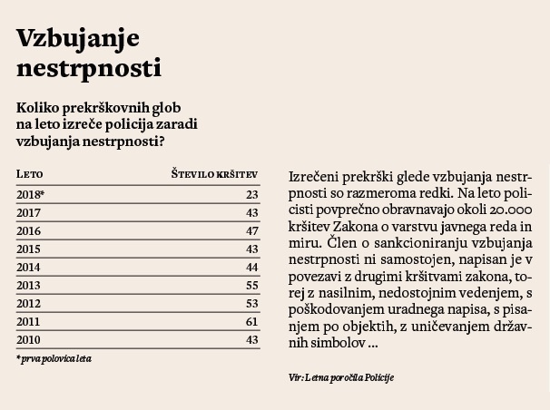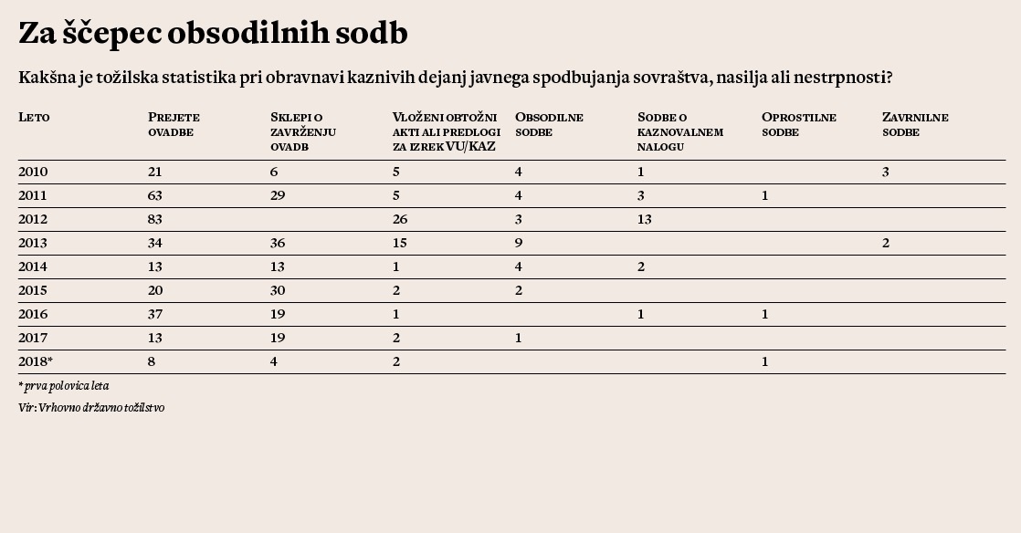 Sedanja neaktivnost tožilstva je posledica dolgoletnega sprenevedanja. In prakse. Res je, da je tožilstvo leta 2013 sprejelo posebno pravno stališče do pregona sovražnega govora, a v njem vztraja pri zelo restriktivnih načelih, pri neposredni vzročni vezi med »hudimi besedami in nasilnimi dejanji«, v nasprotnem primeru naj bi prišlo do uvedbe »golega verbalnega delikta«. V Sloveniji je sicer sovražni govor inkriminiran tudi na ravni prekrška, policisti se za kaj takega redko odločajo, na leto napišejo nekaj deset glob. Raje primere, če že, prepustijo tožilstvu, ti pa večino ovadb mirno zavržejo.