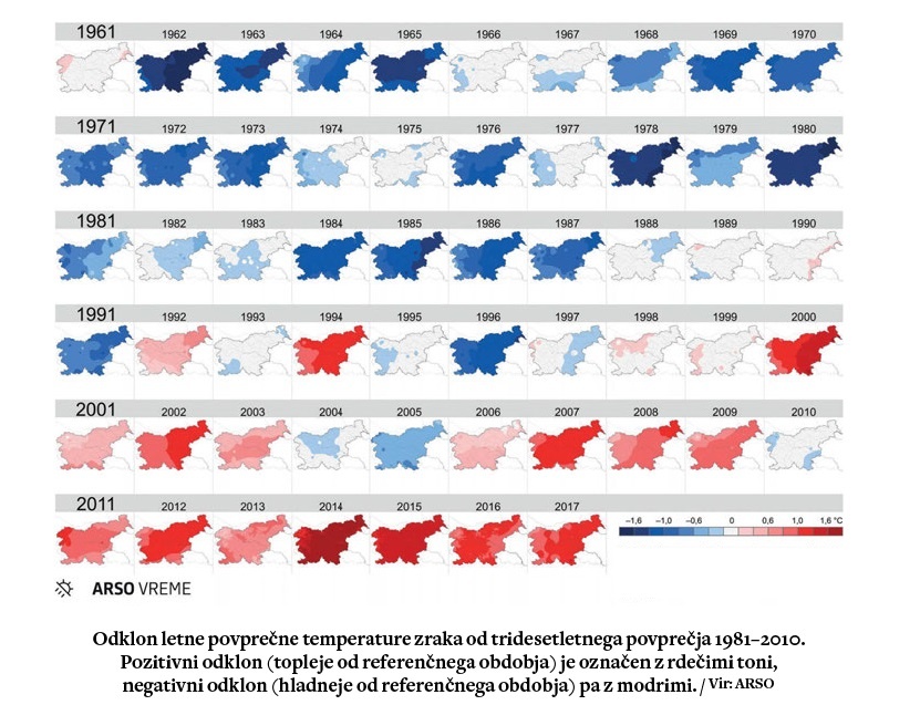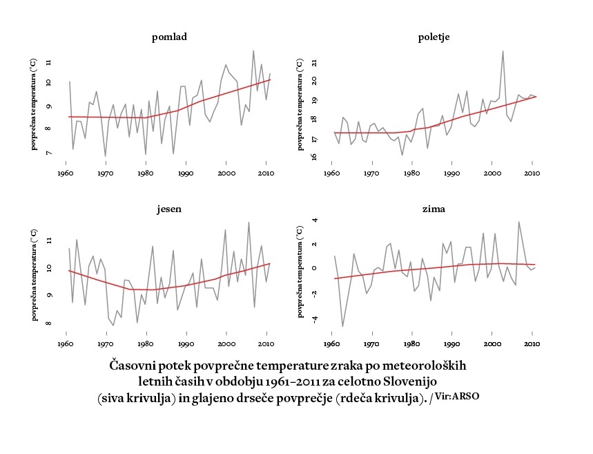 »Ljubljana ima danes take temperature, kot jih je imel precejšen del Primorske pred 50 leti,« razlaga Gregor Vertačnik, klimatolog z republiške Agencije za okolje. »Nekatera območja v Alpah, na primer Rateče ali Bohinj, so danes temperaturno blizu Ljubljanski kotlini izpred 50 let.« Analiza vremenskih podatkov od leta 1961 kaže, da je segrevanje najbolj opazno poleti, nekoliko manj spomladi in pozimi, jeseni pa je minimalno in na meji statistične napake. »Temperature so se zvišale po celotnem območju Slovenije,« pravi Vertačnik. »Povečalo se je število vročinskih valov, zmanjšalo pa število hladnih obdobij.«