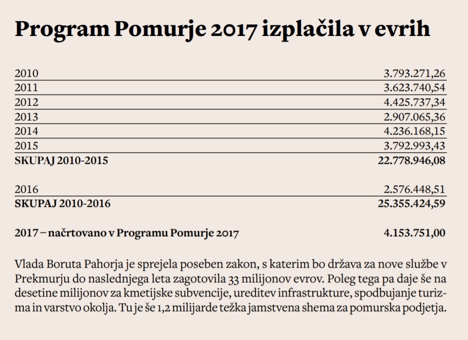 To pa še ni vse. Neslavno prvo mesto na omenjenem seznamu Cerarjeve vlade je pomenilo, da je Pomurje tudi prvo na vrsti, ko se delijo državna sredstva za velike naložbe, ki naj bi pomembno dvignile življenjsko raven. Do leta 2020 bo država med drugim uredila vodovod v Rogaševcih, reševalno postajo v Murski Soboti in biosferno območje reke Mure; skupna vrednost vseh projektov po tem programu znaša okoli 188 milijonov evrov. Na področju kmetijstva pomembne spodbude zagotavljajo subvencije, ki jih prek razpisov deli Agencija za kmetijske trge, poleg tega denarja pa prekmurski kmetje dobivajo še sredstva iz Programa razvoja podeželja, ki jih zagotavljata slovenski in evropski proračun. Leta 2016 je bilo iz tega naslova v Pomurski regiji razdeljenih dobrih 32 milijonov evrov. In končno je tukaj še 1,2 milijarde poroštev Slovenskega regionalno razvojnega sklada za kredite za malo gospodarstvo v najbolj severovzhodnem koncu države. Ves ta denar seveda ne more odpraviti težav, s katerimi se spopadajo ljudje ob madžarski meji. A brez njega bi bilo še znatno slabše.