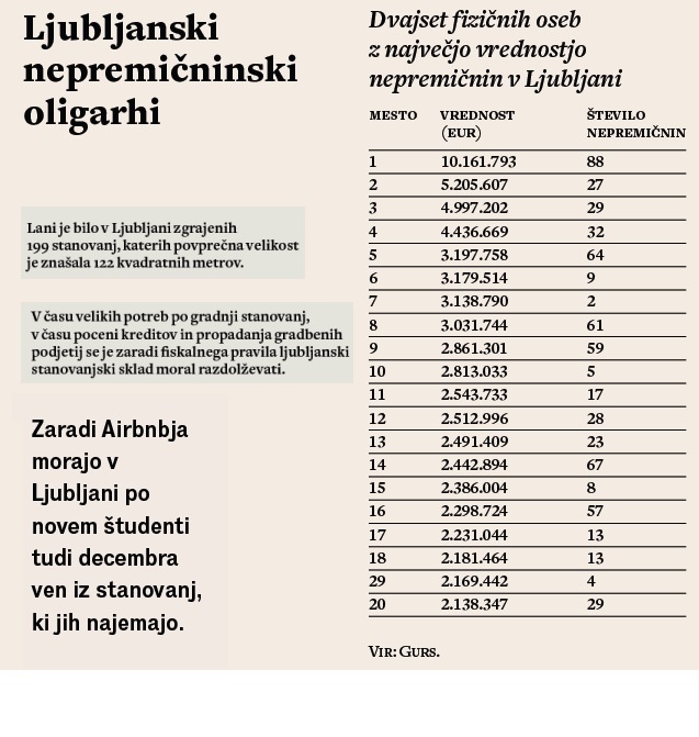 V zadnjih štirih letih se je število vseh stanovanj v Ljubljani povečalo za 445, hkrati pa je bilo v tem obdobju kar 1136 več nenaseljenih stanovanj, v katerem nima nihče prijavljenega stalnega prebivališča. To so večinoma stanovanja, ki jih premožnejši kupujejo kot investicije. Kako velike so že špekulacije s stanovanji v našem glavnem mestu, kažejo podatki, ki so jih za nas pripravili v republiškem geodetskem uradu. Zgolj prvih petdeset fizičnih oseb ima v Ljubljani v lasti skupaj že 1422 nepremičnin, vrednih 121 milijonov evrov. Prvi na seznamu ima 88 nepremičnin, vrednih 10 milijonov evrov.