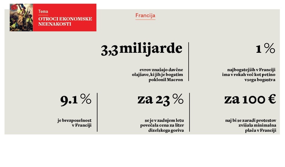 In tu je problem: kaj je njihovemu življenju vzelo dostojnost? Kaj je njihovemu življenju vzelo življenje? Kaj jih je v resnici sprožilo? Kaj jih je dejansko pognalo v bes in revolt? Prisluhnite jim – davčni sistem ni pravičen, poudarjajo. In to je refren. Davčni sistem ni pravičen! In podražitev bencina je del tega nepravičnega davčnega sistema. Prav res: podražitev bencina je dodatna obdavčitev (»ogljični davek«), ki je višji, sploh pa najvišji sloji – elite – ne čutijo. Niti malo. A natanko takšna je logika neoliberalnega – nepravičnega – davčnega sistema: bogati, najvišji sloji, elite so obdavčeni tako, da tega sploh ne čutijo. Še več: natanko takšna – neoliberalna, nepravična, regresivna – je bila Macronova logika »reformiranja« Francije: Macron, samozvani »patriot«, ki je pred volitvami nastopal kot anti-Orban in anti-Trump, je namreč takoj po prevzemu oblasti davčno razbremenil bogate ter korporacije in podjetja, z multinacionalkami vred, kmalu zatem pa je uvedel še enotno davčno stopnjo, ki je kapital dodatno razbremenila. Bogati davkov ne čutijo več, nižji sloji pač – vse bolj. O vseh tistih novih, dobro plačanih delovnih mestih in vsej tisti blaginji, ki naj bi jih ustvarile davčne razbremenitve elit, korporacij in kapitala, ni ne duha ne sluha. Da je Macron, nekdanji bančnik, podražitev goriva razglašal za »podnebni davek«, s katerim naj bi financirali francoski prehod na čisto, brezogljično energijo, pa itak kaže, da je neoliberalni blef res brez meja – poskus tipične neoliberalne razlastitve nižjih slojev so prikazali kot skrb za podnebje in čisto okolje!