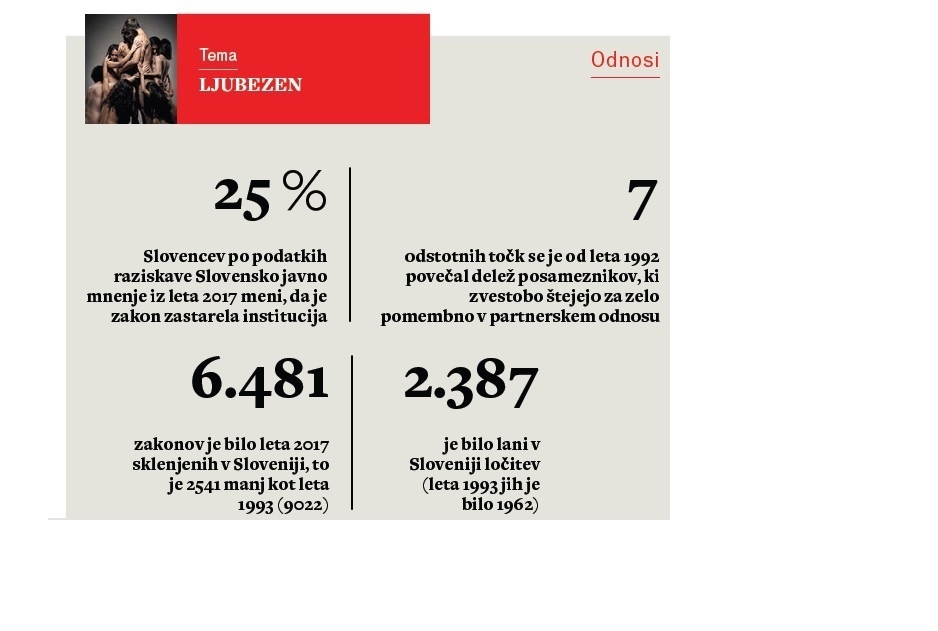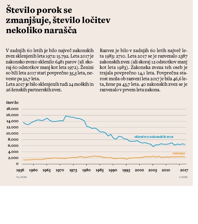 Spremembe trendov v razmerjih bi lahko sčasoma vodile tudi v to, da se bo vse manj ljudi odločalo za poroko. To se deloma že dogaja – statistični podatki, pridobljeni z raziskavo Slovensko javno mnenje 2017, kažejo, da danes 25 odstotkov Slovencev soglaša s trditvijo »Zakon je zastarela institucija«, leta 1992 jih je to menilo približno 15 odstotkov. Institucija zakona konec koncev izhaja iz časov, ko je »do konca svojih dni« pomenilo 20 let, danes, ko živimo 80 let ali še dlje, pa lahko, če se odločimo ostati s prvim resnejšim partnerjem, ki ga v povprečju spoznamo okoli 20. leta, pomeni tudi 60 let. Poroka tako ni več obred, ki bi posameznika povezal za vedno, ampak še ena priložnost za dober žur – pa četudi čez dve leti ne bomo več z istim človekom. »Institucija zakona ima vedno manjšo veljavo, že to, da imaš v zunajzakonski skupnosti skoraj enake pravice, kot če si poročen, veliko pove. Kar se mi torej zdi pomembno v zvezi s poroko, je to, da je obred, obredi pa so zelo pomembni za duševno blaginjo ljudi, delujejo kot neko socialno lepilo,« pravi Katarina Veselko. »To, da organiziramo dogodek okoli tega, da se nekaj zgodi, vpliva na to, kako to doživljamo. Obredi poleg tega niso namenjeni samo tistim, ki so v njihovem središču, ampak tudi vsem, ki so jim priča, dejansko povezujejo skupnost. Zaradi tega se mi zdi, da ljudje, ki se danes odločijo za poroko, to odlagajo, dokler si ne morejo poročnega obreda privoščiti na tak način, kot si želijo – ker je obredna vrednost poroke pač tako pomembna. Skupnih obredov je predvsem pri nevernih ljudeh zelo malo, dandanes je torej ključni element tega, da se poročiš, da pripelješ skupaj ljudi.«