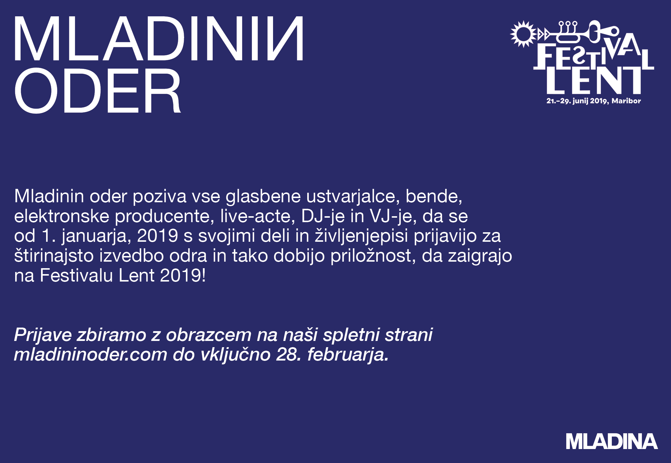 Mladinin oder poziva vse glasbene ustvarjalce, skupine, elektronske producente, live-acte, didžeje in vidžeje, da se s svojimi deli in življenjepisi prijavijo na 14. izvedbo odra in tako dobijo priložnost, da zaigrajo na Festivalu Lent 2019. Prijave zbirajo z obrazcem na njihovi spletni strani do vključno 28. februarja.