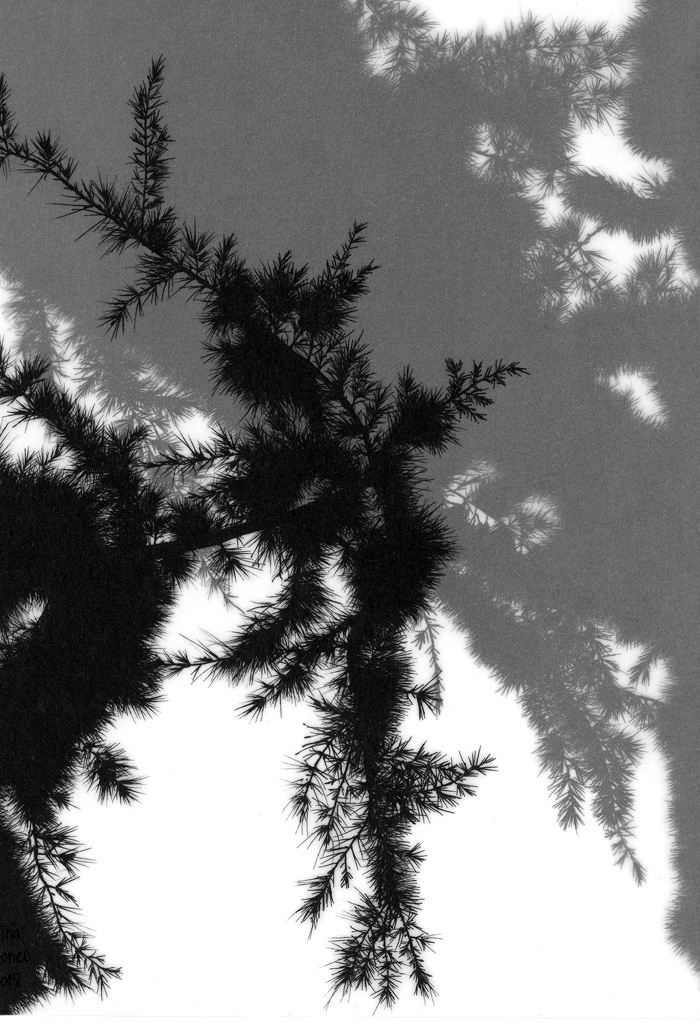 Tina Konec (letnik 1992), nagrajena diplomirana slikarka, že nekaj let riše drevesne krošnje, za tehniko pa je izbrala svinčnik ali tuš na beli ali črni papirnati podlagi. Njene stvaritve vzbujajo igro asociacij, saj ljudje v monokromnih risbah prepoznajo gube na dlaneh, vesolje v ptičji perspektivi, lišaj, pripet na staro stavbo, pomečkane oblake in še kaj. Fotografij ne poskuša zgolj prerisati, temveč na samosvoj, prepričljiv način poustvariti podobe. Razstava V megli prikazuje serijo del, ki sledi poteku dneva: začne se na zaspano januarsko jutro, zavito v meglo, nato pa nas vodi skozi različne letne čase, ki jih tako ali drugače ovija megla.