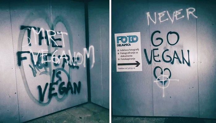 Anja Radaljac, avtorica bloga Travožer, ki obravnava pravice živali in veganstvo, je pred kratkim na Facebooku objavila opozorilo, kakšni napisi so prekrili proveganske grafite. Njena objava je sprožila številne nepotrebne napade. Nekdo je šel celo tako daleč, da je kot rešitev za umik veganov zagovarjal genocid, pojavilo pa se je tudi več groženj z umorom. Anja Radaljac opozarja, da je v teh razpravah ogromno nasilnega govora proti ženskam, denimo o feministkah vegankah. »Desnica zelo jasno umešča veganstvo v levi del političnega spektra, nanj pa veže najsurovejše oblike nasilja – zagovor genocida, nacionalizma, hudih oblik seksizma/šovinizma. Aktivistke in aktivisti smo že prejeli več smrtnih groženj oziroma javnih zapisov, da bi nas bilo treba poklati/pobiti. Veganstvo je tema, ob kateri nasilje in sovraštvo bruhata iz ljudi v odnosu do vseh mogočih skupin,« dodaja in poudarja, da gre pri veganstvu za vprašanje etike in nenasilja do vseh čutečih zavestnih bitij, pacifizma, kritike političnoekonomske ureditve in potrošništva. Odprava kapitalizma je recimo ena od temeljnih zahtev političnega veganstva.