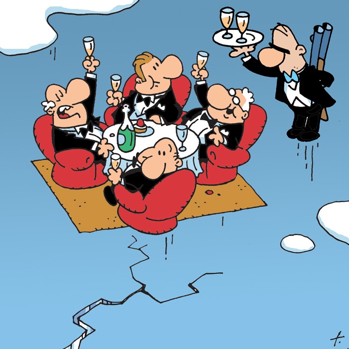 Toda visoki zbor globalnih menedžerjev, vsakovrstnih gurujev, politikov in slavnežev se obnaša, gledano scela, kot da nima nič s klavrnim stanjem sveta in nonšalantno poziva k zaupanju v globalni kapital(izem). Čeprav je neoliberalni kapitalizem osnovni vzrok za drsenje v vsesplošno krizo, večina davoških gostov spada v sloj, ki ta kapitalizem poganja in je njegov največji dobičkar.