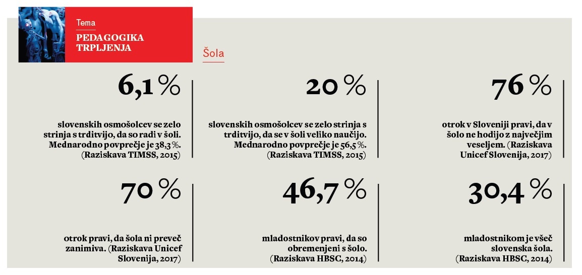 Kakorkoli obračamo, stanje ali pa vsaj dojemanje tega stanja v slovenski šoli vseeno ni dobro. Mednarodna raziskava Z zdravjem povezano vedenje v šolskem obdobju (HBSC) je v letu 2014 pokazala, da je slovenska šola všeč samo 30,4 odstotka učencem, bolj fantom kot dekletom. Pokazala je tudi, da je s šolo obremenjenih 46,7 odstotka dijakov in da s starostjo ta obremenjenost raste. Slovenske številke lastnega ocenjevanja obremenjenosti so zelo visoke tudi v primerjalnem vidiku, med 13-letniki se samo dijaki na Malti in v Makedoniji počutijo bolj obremenjeni kot slovenski. Tudi med 15-letniki je Slovenija po obremenjenosti v zgornji četrtini držav, pri čemer so recimo finski otroci še bolj obremenjeni kot slovenski.