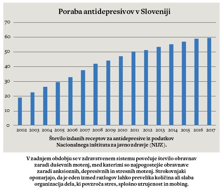 Da se položaj zelo verjetno ne izboljšuje, kažejo podatki Nacionalnega inštituta za javno zdravje o porabi antidepresivov. Leta 2017 je bila poraba teh ponovno za dva odstotka višja kot leto poprej. Leta 2017 smo v Sloveniji zaužili trikrat toliko antidepresivov kot leta 2002. Eden izmed razlogov za to naraščanje naj bi bile čezmerne obremenitve zaposlenih. O tem sta že v leta 2012 izdanem poročilu o psihosocialnih tveganjih na delovnem mestu pisala Aleksandra Kanjuo Mrčela in Miroljub Ignjatović s Fakultete za družbene vede. Zapisala sta, da zaposleni v Sloveniji več delajo kot zaposleni drugod v Evropi, so manj zadovoljni z delovnimi razmerami in doživljajo večjo zaposlitveno negotovost. Doživljanje stresa, splošne utrujenosti, naraščanje mobinga naj bi kazali na preveliko količino in slabo organizacijo dela. Je mogoče sklepati, da so se na ministrstvu za kulturo zaradi čezmernih obremenitev znašli v peklu?