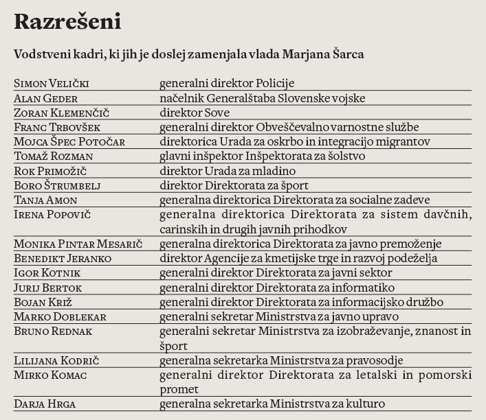 Koliko in koga je tako v prvih petih mesecih zamenjala vlada Marjana Šarca? Po podatkih vladnega urada za komuniciranje so predsednik vlade in ministri doslej zamenjali 20 vodstvenih delavcev. Med drugim tudi generalnega direktorja policije, načelnika generalštaba slovenske vojske in direktorja obveščevalno-varnostne službe, za katere smo se že navadili, da skorajda po pravilu prihajajo in odhajajo z vsako novo vlado.