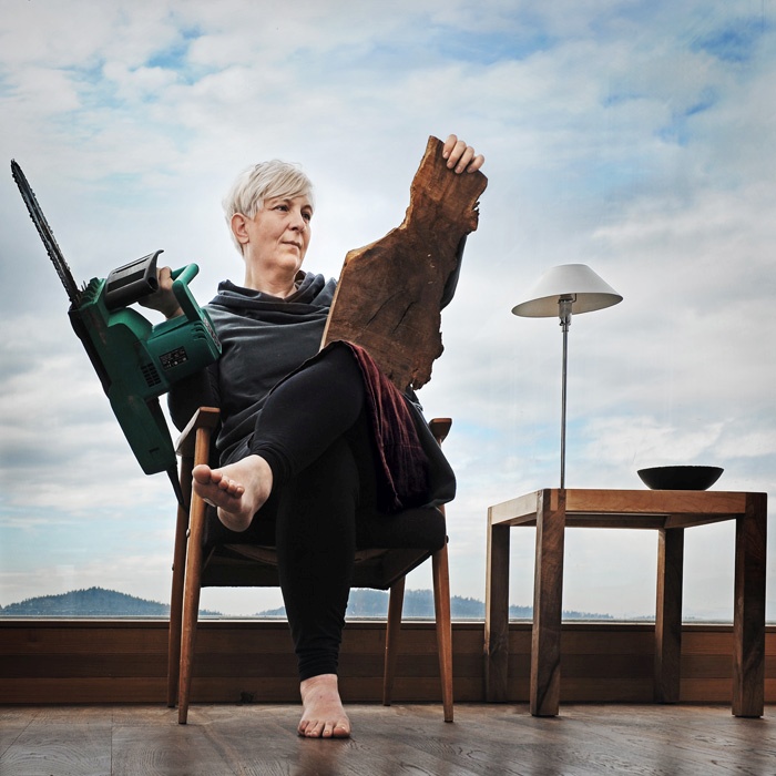 Leto dni je trajalo, da je ugotovila, kaj jo zanima. Nenadoma ji je nekega jutra postalo jasno in rekla je partnerju: »Ej, delala bom z lesom!« Spomnila se je, da je to čas, ko se umiriš in pozabiš na vse. Izkušenj je imela malo, v mladosti je imel oče v garaži brusilni aparat, nekoč v odraslosti je na lastno pest restavrirala staro dedkovo mizo. Prek interneta si je naročila dleta, ki so se izkazala za popolnoma neuporabna, a takrat tega ni vedela. Manjkal ji je še kos lesa, in sramežljivo pove, da je zanj uničila star stol z začetka stoletja. A potrebovala je oreh. Zdaj se ji zdi to popolnoma nespoštljivo. Poskušala je in poskušala, in ko jo je partner videl vso krvavo po rokah, je rekel: »Kupujeva stružnico.« V prostem času je začela stružiti, učila pa se je s pomočjo YouTuba, ki se je izkazal za odprto univerzo, kjer najboljši mojstri na svetu pokažejo in povedo vse. Nekaj mesecev se je učila tako in izdelovala sklede. Prišlo je novo leto in prijatelji so jo poprosili, naj jim izdela darila. Nastajati so začele prelepe hrastove deske z značilnim simbolom dveh pik in potem se je odprlo: nosilci za telefone, miniaturno pohištvo, podstavki za knjige … po letu dni je odprla profile na socialnih omrežjih in spletnih trgovinah ter prodajala tudi od doma, še vedno večinoma znancem in prijateljem. Z izkušnjami iz knjižnega marketinga je ustvarila blagovno znamko in se začela tržiti. Odprlo se je. Celo tako zelo, da je po letu in pol pustila službo in se v popolnosti posvetila izdelovanju predmetov iz lesa. Postala je rokodelka 21. stoletja. Njen glavni motivator, stroj za spodbujanje in rojevanje novih idej, je danes Marko Brumen, njen prijatelj s Twitterja, ki je postal prijatelj tudi v realnem življenju. Njena prijateljica, oblikovalka Zarja Vintar, presoja, ali je izdelek kakovosten, mož pa ji zagotavlja tehnično podporo, kadar je ta potrebna.