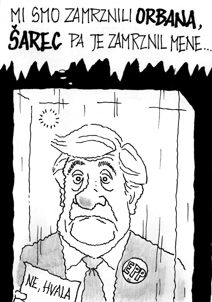 Vsled pisma madžarske veleposlanice v Sloveniji, ki nas je okarala (celotno pismo je objavljeno v tej Mladini na 4. strani), da smo njenega ljubljenega vodjo grdo in zlobno upodobili na naslovnici prejšnje Mladine, se je naš pohlevni karikaturist posul s pepelom in našega ljubega Viktorja ponovno narisal. Tokrat lepšega in bolj prijaznega. Naj živi ljubezen med Orbánom in Janšo!