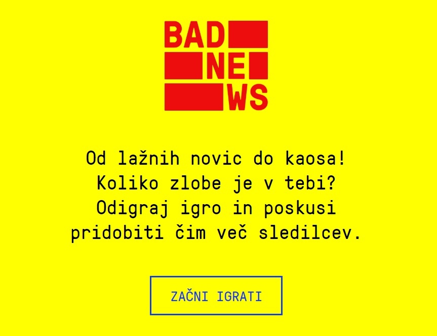 Spletna igra Bad News, ki ljudi ozavešča o tem, kako na spletu zaznati dezinformacije in lažne novice, je zdaj na voljo tudi v slovenskem jeziku. Poleg tega je na voljo še različica junior, namenjena otrokom, starim od osem do deset let.