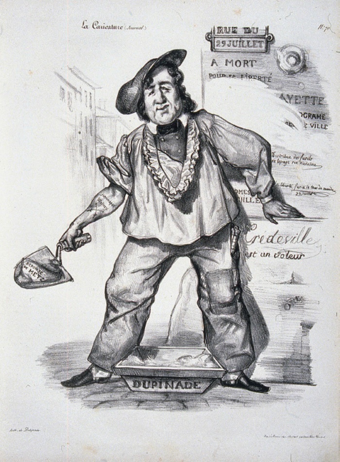 Karikatura – Replàtrage, objavljena v časopisu La Caricature 30. junija 1831. Naslov govori o ’krpariji’ in karikatura kaže, kako kralj z mavcem prekriva manifest zapisanih načel, zahtev in pridobitev julijske revolucije. Zaradi nje je moral avtor Charles Philipon v zapor.