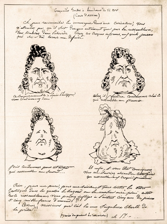 Skica, na kateri se francoski kralj spreminja v hruško. Med sojenjem jo je narisal Charles Philipon, kasneje je bila objavljena v ilustriranem časopisu La Caricature, po Philiponovi risbi jo je za tisk izrisal Honoré Daumier.