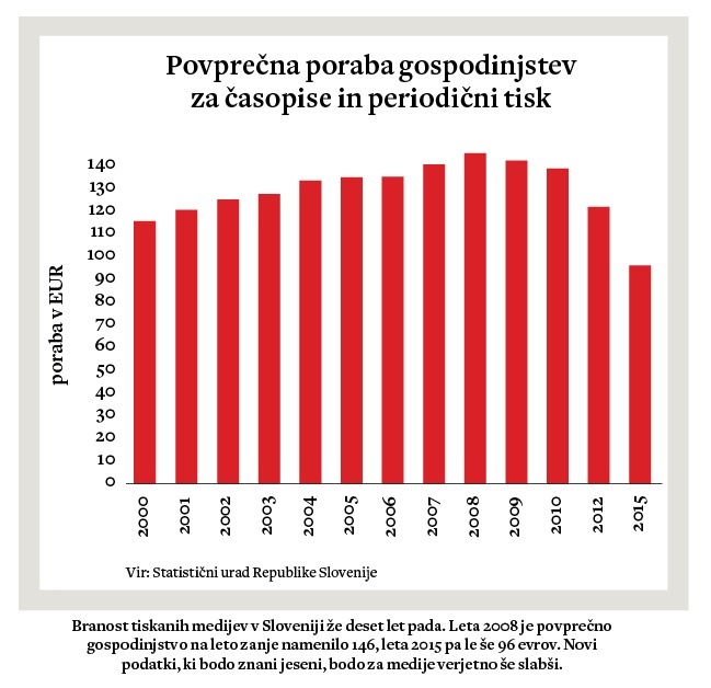 Številke so neizprosne. Po podatkih Statističnega urada Republike Slovenije je povprečno gospodinjstvo za nakup časopisov in drugega periodičnega tiska leta 2015 porabilo 96 evrov, še leta 2008 pa je bila ta številka 146 evrov. Novejši izsledki, ki bodo objavljeni jeseni, bodo pokazali, da so razmere za tiskane medije zdaj še slabše.