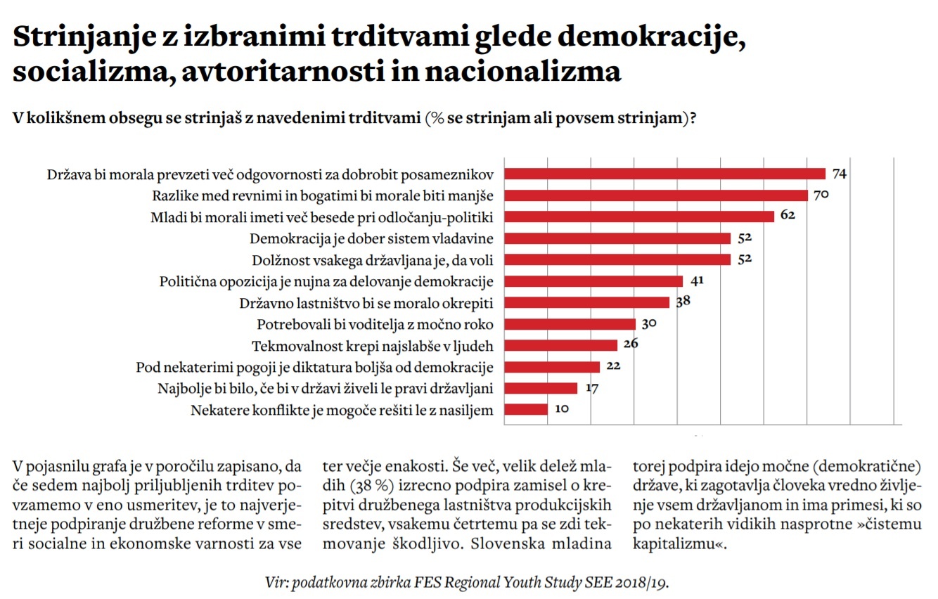 V povzetku izsledkov obsežne raziskave Slovenska mladina 2018/19, te dni so ga v sodelovanju z nemško Fundacijo Friedricha Eberta Stiftunga objavili slovenski raziskovalci z mariborske univerze, je zapisana na prvi pogled nenavadna ugotovitev; sicer je takšnih še več, a ostanimo predvsem na polju političnega in družbenega razvoja. Raziskovalci so po obsežnih intervjujih in anketiranju sklenili, da mladi v Sloveniji »močno podpirajo družbeno reformo v smeri demokratičnega socializma – družbena in gospodarska varnost za vse ter večja enakost so skoraj splošno sprejeta stališča«. Hkrati opozarjajo, da so »avtoritarne tendence med mladimi razmeroma šibke«, se pa lahko hitro okrepijo, še posebej, »če bi se gospodarske razmere (vključno z brezposelnostjo, gospodarsko blaginjo in neenakostjo) v prihodnosti poslabšale«.