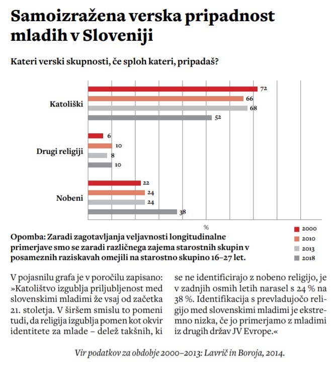 Raziskava razkriva še eno zanimivost. Delež samoopredeljenih pripadnikov katoliške cerkve se med mladimi v Sloveniji naglo zmanjšuje (od leta 2000 do leta 2018 se je zmanjšal z 72 odstotkov na 52 – zgolj za primerjavo: mladih, ki se identificirajo s katolištvom, je na Hrvaškem recimo še vedno 90 odstotkov). Na drugi strani se je povečal sicer majhen, a izrazit delež globokih vernikov, tistih mladih torej, ki jim vera pomeni enega od temeljnih gradnikov identitete. Ravno med temi mladimi, v skupini najbolj vernih, so ravni višje religioznosti povezane z višjimi ravnmi nacionalizma, politične avtoritarnosti, še posebej močno z desno politično usmeritvijo. Ali z drugimi besedami: med slovenskimi mladimi je religioznost tesno povezana s političnim desničarstvom in avtoritarnostjo. Raziskovalci so hkrati ugotovili, da so korelacije med religioznostjo in desno politično usmeritvijo v Sloveniji bistveno višje kot v drugih državah Jugovzhodne Evrope.