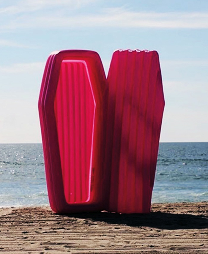 Napihljiva krsta je videti kot nekaj, kar bi na počitnice vzeli Addamsovi. V črni različici, seveda. Kljub svoji roza barvi vzbuja drugačne občutke od siceršnjih napihljivih pripomočkov, ki jih srečamo ob morjih, jezerih in bazenih. Prav to radikalno drugačnost sta želela doseči njena stvaritelja, kanadska industrijska oblikovalca Andrew Greenbaum in Ian Felton. Za napihljivo krsto sta najprej dve leti iskala proizvajalca in nato lani pogorela na platformi Kickstarter, saj za izdelek kljub viralnemu spletnemu odmevu ni bilo dovolj finančnih podpornikov. V okviru svojega podjetja Pom pom zdaj napihljivo roza krsto ponujata za 99 ameriških dolarjev, kmalu pa naj bi se ji pridružili še drugi neobičajni napihljivčki. Priporočajo, da plavajoče krste, ki je – kljub morbidnemu prizvoku – prvotno namenjena zabavi, ne uporabljajo mlajši od štirinajstih let. Vanjo se lahko po dolgem udobno uleže ena odrasla oseba, počez pa se lahko v krsto usedejo celo štiri. Njen pokrov je snemljiv, zato lahko služi tudi kot dodatna plavajoča blazina. Vsekakor pa resno odsvetujemo ležanje na soncu v pokriti plastični trugi.