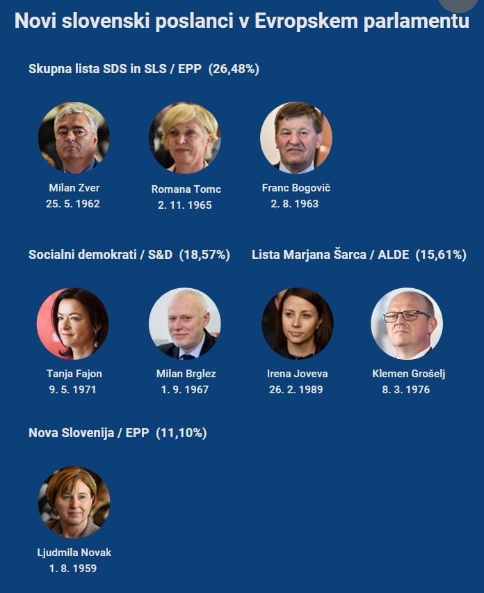 Novi evropski poslanci so: Milan Zver (SDS), Romana Tomc (SDS), Franc Bogovič (SLS), Tanja Fajon (SD), Milan Brglez (SD), Irena Joveva (LMŠ), Klemen Grošelj (LMŠ) in Ljudmila Novak (NSi). Gre za delne uradne izide, ki se lahko še spremenijo, končni rezultati bodo namreč znani šele na začetku junija.