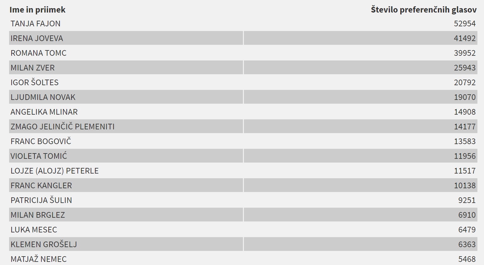 Največ preferenčnih glasov je prejela Tanja Fajon, skoraj 53.000, na drugem mestu je pristala Irena Joveva z dobrimi 41.000.