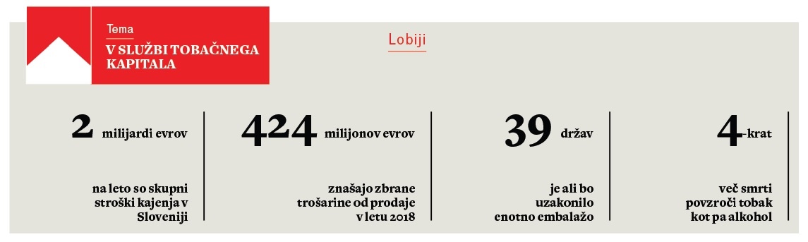 Očitno je pri nas drugače. Ko se je leta 2016 Slovenija odločila za uvedbo enotne embalaže, so tobačne multinacionalke plačale raziskavo v njihov prid pri Inštitutu za primerjalno pravo, češ da je uvedba enotne embalaže nesorazmeren in neustaven ukrep. Na svojo stran so zaradi zaščite blagovnih znamk skorajda dobile tudi parlamentarno zakonodajno-pravno službo. Multinacionalke so nato pri Centru poslovne odličnosti Ekonomske fakultete naročile raziskavo, ki je dokazovala, da bi tak ukrep krepil črni trg. Tako so prepričale tudi finančno ministrstvo.