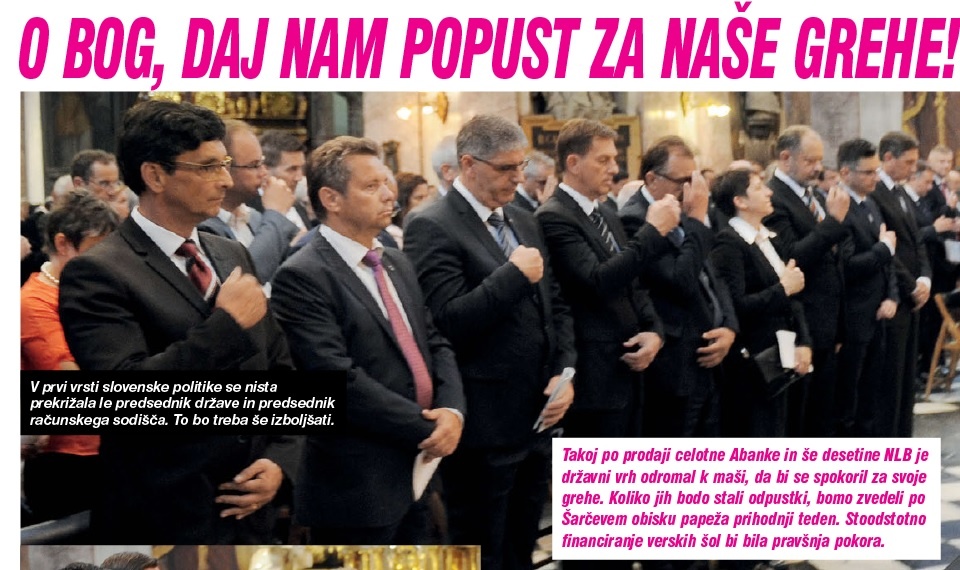 Takoj po prodaji celotne Abanke in še desetine NLB je državni vrh odromal k maši, da bi se spokoril za svoje grehe. Koliko jih bodo stali odpustki, bomo zvedeli po Šarčevem obisku papeža prihodnji teden. Stoodstotno financiranje verskih šol bi bila pravšnja pokora.