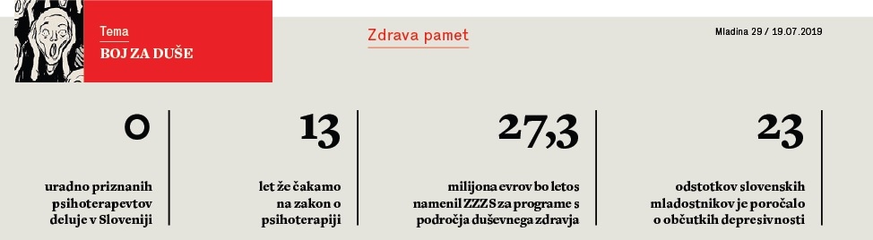Število uradno priznanih psihoterapevtov, ki delujejo v slovenskem prostoru, je znano: nič. Naša država namreč tega poklica sploh ne pozna in ta še vedno ni opredeljen v registru poklicev. Rekli boste, kako je to mogoče, ko pa so psihoterapevti vendar povsod, knjigarne so polne njihovih knjig z nasveti za srečno življenje, priljubljene revije v vsaki številki objavljajo intervjuje z njimi, najbolj znani se nam celo smejijo z obcestnih plakatov. Vendar ti ljudje oziroma njihova podjetja, espeji, »klinike«, inštituti in zavodi v poslovnem registru formalno niso registrirani za izvajanje psihoterapije, temveč za »druge zdravstvene dejavnosti«, delujejo pa zunaj zdravstvenega, socialnega in šolskega sistema, povsem na svojo roko in samoplačniško – pa če jim to ustreza ali ne.