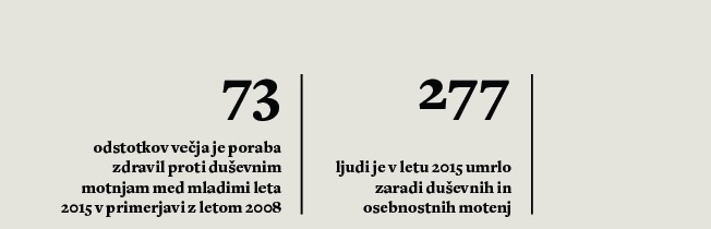 Sivi trg psihoterapije, ki deluje vzporedno, pa lahko cveti, ker se za specializacijo klinične psihologije in psihiatrije ne odloči toliko študentov, da bi lahko zadovoljili naraščajoče potrebe prebivalstva. Po podatkih evropske komisije iz leta 2015 je bilo v Sloveniji na sto tisoč prebivalcev 13 kliničnih psihologov; manjši delež je zabeležila le Češka, kjer so zato že predlagali drastično povečanje števila omenjenih kadrov. Podobno je s psihiatri, tudi tukaj smo na repu EU; na milijon prebivalcev jih je po analizah Eurostata 128, kar je skoraj pol toliko kot na primer na Finskem (236) ali Nizozemskem (230). Dodatna težava je, da struktura sistema ni ustrezna, kadri pa ne primerno porazdeljeni, razlaga Vesna Švab: »Večina kliničnih psihologov in psihiatrov je skoncentrirana po bolnišnicah in klinikah, ne pa na terenu, kjer so najbolj potrebni. Devetdeset odstotkov duševnih motenj se pojavi v neformalnih mrežah, v soseski, doma, na ulici, skratka na ravni, ki jo pokriva primarno zdravstvo. Na tej ravni najbolj primanjkuje psihologov in psihiatrov.« Obenem duševne motnje pri nas postajajo vedno večja težava, zlasti med mladimi. Z analizo duševnega zdravja otrok in mladostnikov, ki jo je pripravil Nacionalni inštitut za javno zdravje, so ugotovili, da se je od leta 2008 do 2015 povečalo število zunajbolnišničnih obravnav zaradi reakcije na hud stres, anksioznih motenj, hiperkinetične motnje in motenj hranjenja. Naraščajo tudi bolnišnične obravnave zaradi hiperkinetične motnje. Samomor je bil v zadnjem desetletju med mladostniki od 15 do 19 let skoraj vsako leto med prvimi tremi vzroki umrljivosti.