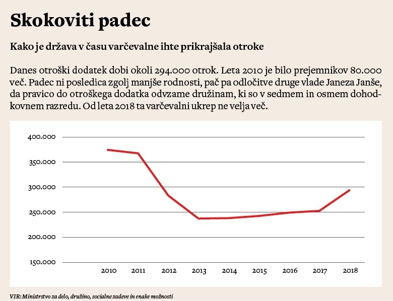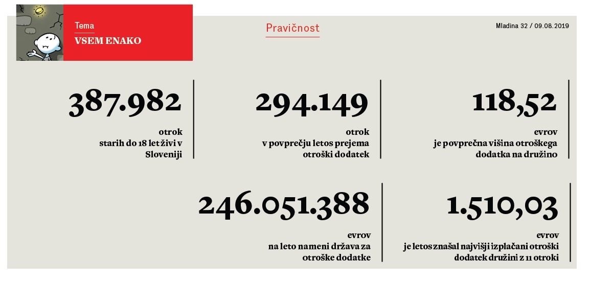 Ideja o univerzalnem otroškem dodatku zveni zelo dobro. Danes namreč otroškega dodatka ne dobijo vsi otroci, pač pa le tisti, katerih mesečni dohodek na člana družine ne znaša več kot 1034 evrov. Takšnih otrok je v Sloveniji – gre za tiste, ki niso polnoletni – malo več kot 290.000, država pa za otroške dodatke na leto nameni 246 milijonov evrov.