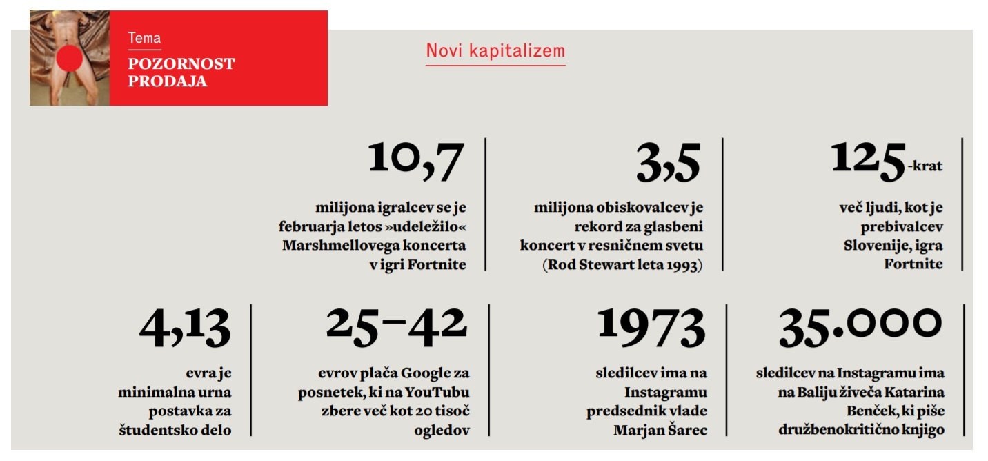 Do tedaj je že postalo jasno, da je ekonomika pozornosti dokončno tukaj in da bo prihodnost njena. Potem je prišla igra Fortnite. Preprosta, vendar hudo zasvojljiva zasnova, po kateri se igralci z vsega sveta združujejo v klane in spopadajo v risankastih bitkah, je obnorela svet. Igra ima registriranih več kot četrt milijarde igralcev – če bi bil Fortnite država, njeni uporabniki pa državljani, bi bila po številu prebivalcev peta na svetu. Povprečen igralec ji vsak teden posveti od šest do deset ur, kar skupaj znese nepredstavljivo količino dragocene pozornosti. Toliko, da so ustvarjalci igre, podjetje Epic Games, z njo lani zaslužili nekaj več kot 2,4 milijarde evrov. Oziroma petino celotnega proračuna slovenske države za leto 2019. In še zanimivost, ki so jo izbrskali pri portalu Siol – igra Fortnite je obsedla tudi zvezdnika lige NBA Luko Dončića; od junija je sodeloval v približno 5000 virtualnih spopadih, vsak dan pa igri nameni kake tri ure pozornosti.