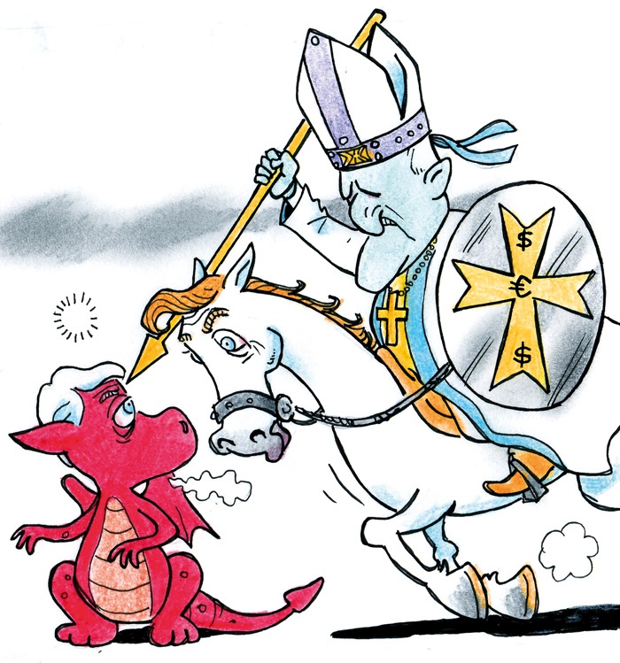 Ko je Franc Rode leta 2004 končal delo v misijonu v eksotični Sloveniji in bil poklican v Rim na visoko funkcijo prefekta Kongregacije za ustanove posvečenega življenja in družbe apostolskega življenja, je imenovanje s ponosom pojasnil: »Z bojnega polja odhajam v generalštab.« Militaristični besednjak se je podal k Rodetovi militaristični naturi in personi. Pač, Rode je po svojem habitusu vselej vojščak, konkvistador. In njegov rod je spadal v artilerijo. Težko artilerijo. To je demonstriral v številnih intervjujih, pridigah, izjavah. Najbolj pa v vsakoletni pridigi ob Marijinem vnebovzetju. Petnajsti avgust sem zato imel vsako leto v koledarju označen na kratko z: Rode! Za ta dan sem vnaprej šilil svinčnik. Nikoli ni razočaral. In ko je odšel, sem si rekel, poslej bo veliki šmaren le še (oziroma spet) verski praznik z nabožno pridigo, homilijo. A sem se zmotil. Rodetova politizacija in ideologizacija cerkvenega praznika sta bila viralni. Vsako leto znova in tako tudi letos. Osrednji happening je bil kajpak, kot vedno, na Brezjah. Zore, kot da bi hotel preseči Rodeta. Za ilustriranje današnjega trenutka in detektiranje zla je letos uporabil prispodobe rdečega zmaja iz Svetega pisma: »Nato se je na nebu prikazalo drugo znamenje: glej, velik zmaj, rdeč kot ogenj, ki je imel sedem glav in deset rogov, na njegovih glavah pa je bilo sedem diademov ... Veliki zmaj, stara kača, ki se imenuje Hudič in Satan in ki zapeljuje vesoljni svet.« (Razodetje 12,3 in 12,9) Prispodoba ima morda svojo biblično literarnozgodovinsko vrednost, za ilustriranje in interpretiranje sedanjosti pa je ne le anahrona, ampak preprosto butasta. Ne vem, morda sem v odnosu do cerkve še vedno naiven. Če je slovenska cerkev vsa dolga poosamosvojitvena leta kazala na druge, na laično državo, ki (za zdaj še) vztraja, da mora biti cerkev ločena od nje; da država skrbi predvsem za državno in javno dobro (šolstvo, zdravstvo, kultura); da o univerzalnih pravicah in svoboščinah državljanov ne more odločati nobena religija ... sem bil prepričan, da bo tokrat sledila zgledu spokorjenega rdečega papeža ter se ukvarjala predvsem s svojim napuhom, pohlepom, brezdušnostjo, grešnostjo. Da bodo izpostavili krščanski imperativ sočutja do aktualnega problema, ne le političnih, ampak tudi ekonomskih migrantov. In da bodo, še zlasti, govorili o pedofiliji. Ki že dolgo ni več le tema poljske, irske, ameriške, avstralske in še kakšne tuje cerkve, ampak tudi akutni problem slovenske. Pri tem ne mislim toliko grešnikov in zločinov iz vrst klerikov, ampak sprenevedajoči se odnos institucije slovenske cerkve do problema. Cerkev je tako dolgo molčala, minimalizirala (Rode: »Pedofilija duhovščine je statistično zanemarljiv pojav«; »posameznih avantur duhovnikov ne gre posploševati«), ščitila storilce in pritiskala na žrtve, dokler je šlo. Ko se je končno oblikovala dokaj glasna civilna iniciativa, ki jo sestavljajo ljudje iz vrst vernikov, žrtev in njihovih svojcev, poskuša preusmeriti pozornost in s prstom pokazati na neučinkovito državo, počasne organe pregona, neustrezno sodstvo. Svetopisemski, apokaliptični »ognjenordeči« zmaj ima devet glav. Zore je v svoji praznični homiliji naštel vsaj tri, štiri: ekskluzivno financiranje laičnega šolstva, grešno avtonomijo ženskega telesa, svobodo izbire partnerstva in družinske oblike. In vselej in vedno ... denar. Cerkev je bila vedno pogoltna. Vsemu bi se vsaj na kratki rok lahko odpovedala, le denarju in bonitetam ne.