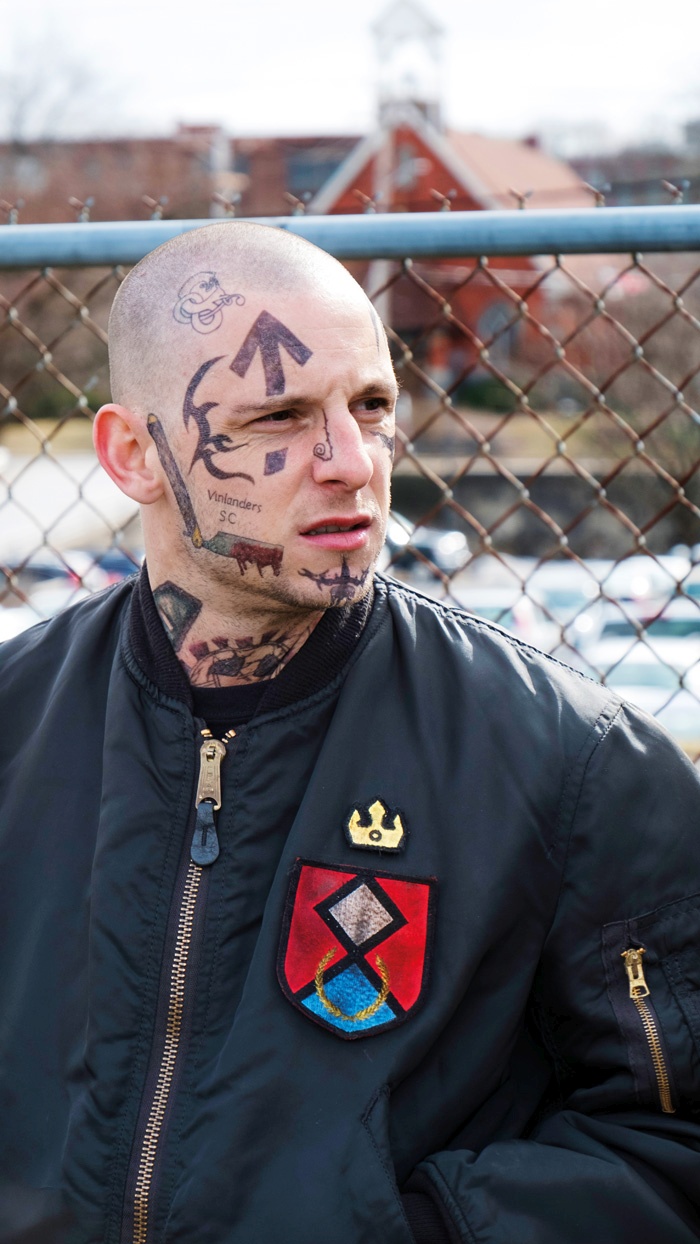 Bryon Widner (Jamie Bell) je ameriški neonacist, belski nacionalist, toda ne prikrit, temveč povsem odkrit, neposreden, popadljiv, brutalen – njegov obraz je hardcore mozaik agresivnih “belskih” tatujev. Ja, ves je potetoviran. Ideologijo nosi na obrazu – kot makeup. Vsak tatu je sporočilo, vsak tatu je izraz “bele moči”, vsak tatu je melodrama belske paranoje, vsak tatu je vzklik “krvi & časti”, vsak tatu je Sieg Heil, vsak tatu je sovražni govor, vsak tatu je vrtinec nestrpnosti, vsak tatu je levitev pošasti, vsak tatu je odmev Trumpovega slogana: “Naredimo Ameriko spet veliko!” Le da se Koža, ki je videti kot nadaljevanje Ameriške zgodovine X, dogaja v preteklosti, ko Trump še ni bil politik in ko še ni mahal s tem sloganom, kar seveda pomeni, da je Bryon Widner ta, ki ga je navdihnil.