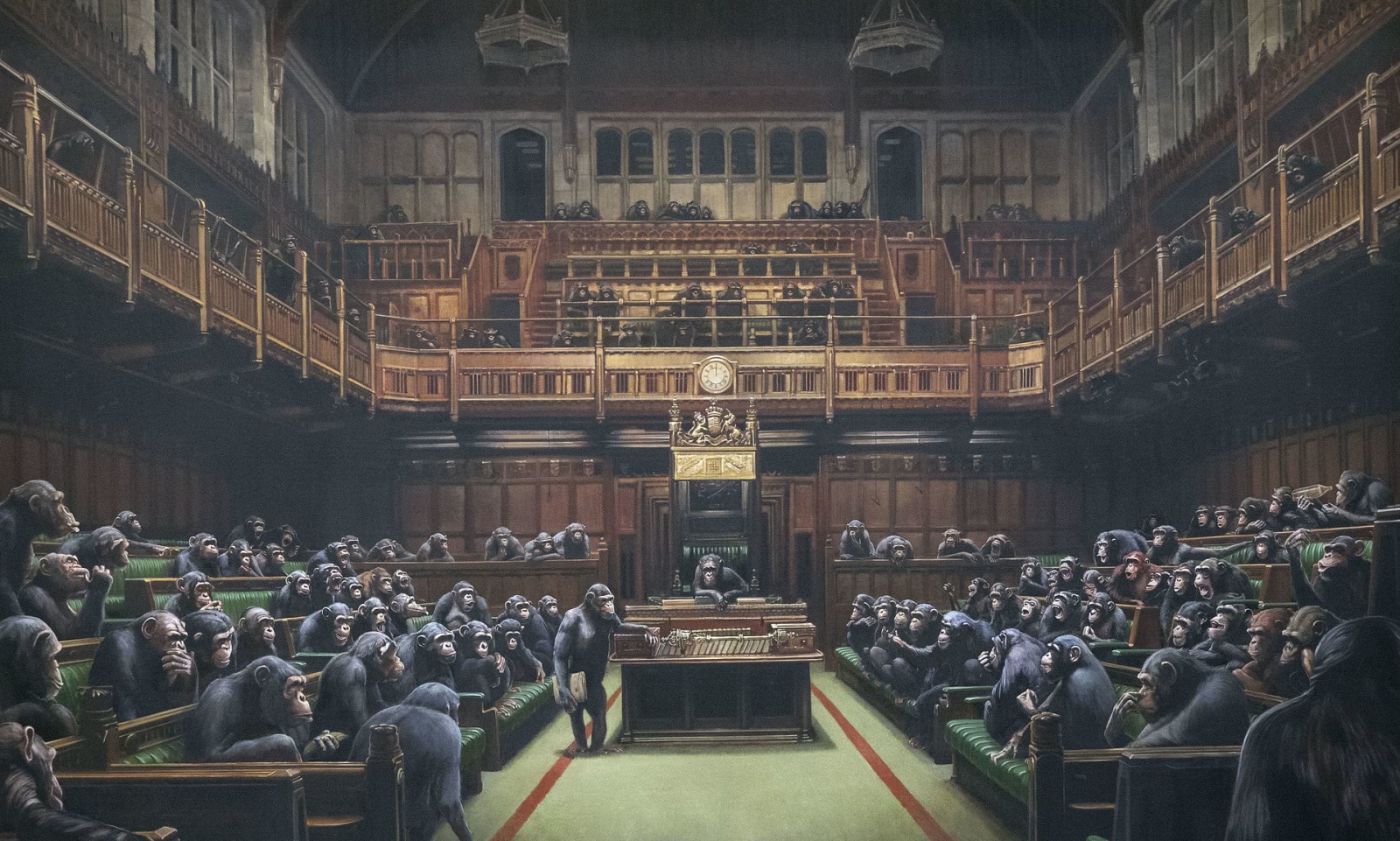 Delo britanskega uličnega umetnika in aktivista Banksyja z upodobljenimi opicami v britanskem parlamentu gre v četrtek, 3. oktobra, na dražbo. Za sliko, ki jo je umetnik ustvaril leta 2009, si obetajo iztržiti do 1,5 milijona funtov, piše francoska tiskovna agencija AFP.