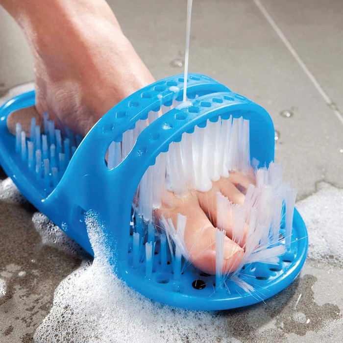 Če se težko ali neradi sklanjate in se vam, kadar stojite pod prho ali ležite v kadi, zdijo vaša stopala neverjetno daleč, lahko za pomoč pri njihovi negi uporabite posebno obuvalo. Plastični natikač s ščetinasto notranjostjo, ki ni namenjen hoji, temveč negi stopal, vas bo odrešil sklanjanja, stanja na eni nogi ali vratolomne telovadbe med kopeljo. S pomočjo priseskov na podplatu natikača slednjega pred uporabo pričvrstite na tla ali stranico kadi, po uporabi pa na kopalniške ploščice, da se odcedi. Ko boste z njim med prhanjem ali kopanjem pošprudlali stopalo, mu boste privoščili tako masažo kot piling ter ga ponegovali od pete do prstov. Več kot tisoč ščetin različnih debelin in dolžin stopalo zmasira ter obdela z vseh strani, s pomočjo ščetin na plastičnem paščku bo poščetkan tudi nart, plovec pa poskrbi za odstranjevanje odmrle kože na peti. Pripomoček za mokro nego stopal lahko uporablja vsa družina in ga je mogoče očistiti v pomivalnem ali pralnem stroju.