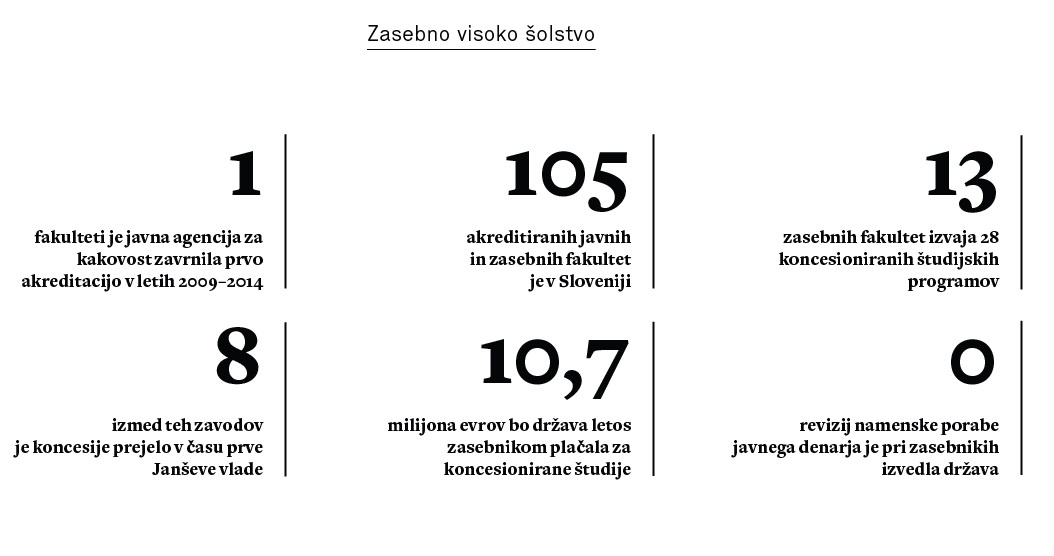 Tako so posamezniki iz desne politične opcije pod Janšo učinkovito izkoristili luknje v zakonodaji in na račun države vzpostavili vzporedni sistem, ki koristi predvsem njim. Od skupaj 13 zasebnih visokošolskih zavodov, ki po koncesijskih pogodbah za posamezne študijske programe dobivajo sredstva iz proračuna izobraževalnega ministrstva, jih je bilo osem akreditiranih v letih 2006 in 2007, torej v mandatu prve vlade SDS. Pri čemer tedaj ni nikogar zanimalo, ali dejansko obstajajo potrebe po teh zasebnih fakultetah in programih, ki jim jih plačuje država. »Danes imajo koncesije tudi takšne ustanove, ki že leta ne zadostujejo standardom glede kadrov, infrastrukture in števila študentov, vendar jih vse od podelitve koncesij ni nihče preverjal,« poudarja Matjaž Krajnc, ki je tudi član delovne skupine ministrstva za izobraževanje, ki zdaj pripravlja spremembo zakonodaje na tem področju.