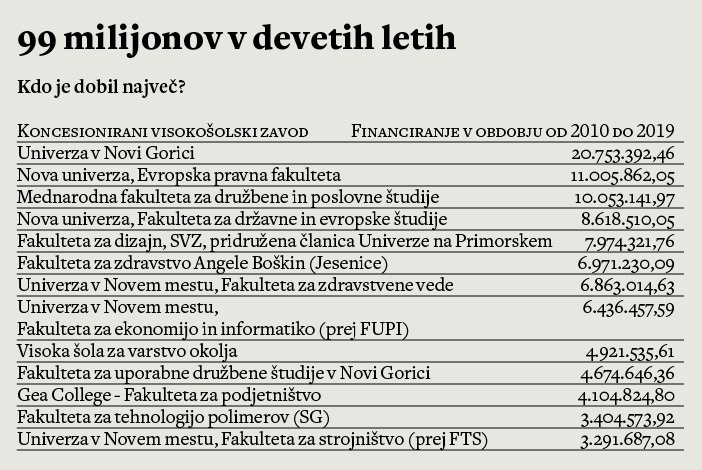 Odsotnost koncesije tudi ni ovira pri črpanju proračunskega denarja za Fakulteto za pravo in poslovne vede, s katero sodeluje ustavni sodnik Klemen Jaklič. Fakulteti, ki je v lasti Katoliškega inštituta in po načrtih RKC pomeni zametek bodoče katoliške univerze, je javni štipendijski sklad samo v zadnjih dveh letih izplačal malo manj kot 155.000 evrov. Novomeška Fakulteta za industrijski inženiring, pri ustanovitvi katere je pomagal tudi Borut Rončević, je samo od tamkajšnje občine prejela 150.000 evrov, republiška agencija za raziskovalno dejavnost pa ji je nakazala slabih 100.000 evrov. Skratka, za zaustavitev nebrzdanega in neupravičenega trošenja javnih sredstev za zasebno terciarno izobraževanje ne bo zadostovala zgolj zaostritev delovanja koncesionarjev, temveč tudi bolj jasni in strožji pogoji na področju raziskovalnega dela in štipendijske politike.