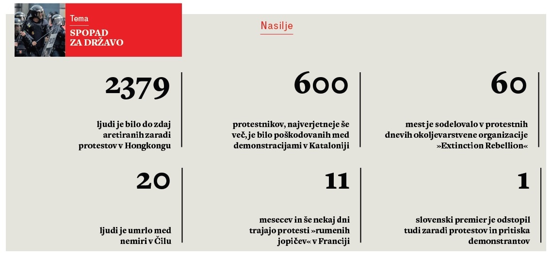 Kaj pomeni vladati z nasiljem, te dni dobro vidimo v Kataloniji, Franciji, Hongkongu, Čilu, Alžiriji, v Libanonu, v Iraku, na Haitiju, Etiopiji, Ekvadorju, Boliviji, po vsem svetu, tudi v Londonu. Tam so – dogodek so mediji prezrli, kar pomeni, da je policijsko nasilje nekaj popolnoma običajnega – nič kaj nežni britanski policisti zaradi napovedi blokade letališča in drugih aktivnosti na začetku oktobra aretirali več kot 1700 pripadnikov okoljevarstvenega gibanja Extinction Rebellion in njihovih podpornikov, pa še kakšnega novinarja zraven. Napadli so vse: ženske, moške, starce, mlade, invalide. Ravnali so nediskriminatorno in grobo.