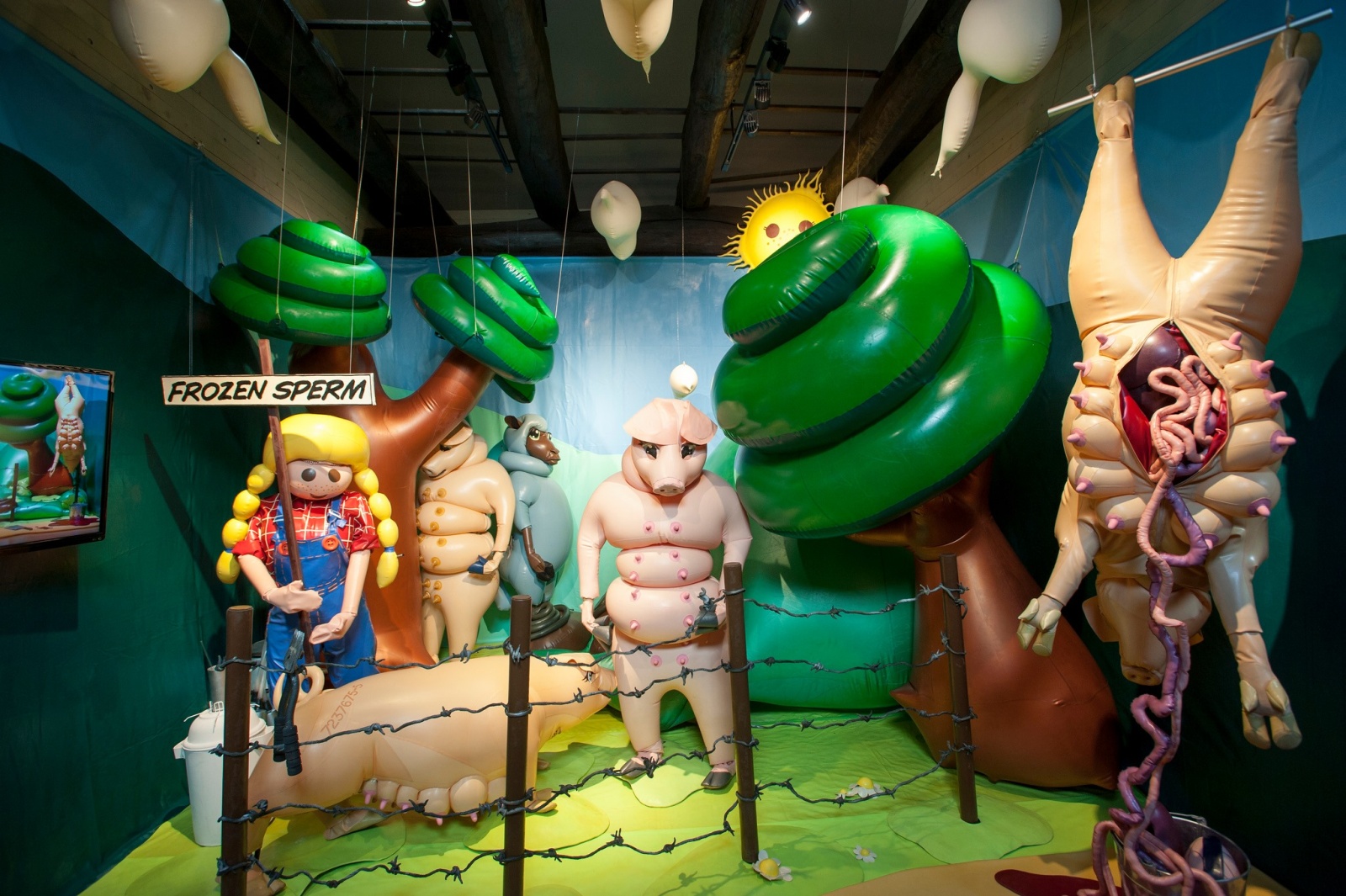 Kmetijo na eni strani razstavnega prostora dopolnjuje svinjak z ogromno umetno oplojeno pujso za rešetkami, ki povrže in hrani prašičke v človeški velikosti, ti pa končajo v klavnici. Mešanica igrive seksualnosti zabaviščnih maskot in sporočilne biološke realnosti nas prek natančno izdelanih japonskih karakternih ljubkosti potiska iz cone udobja, da premislimo o lastni drži in mogočih vprašanjih, ki se nam porodijo ob sprehodu skozi razstavo.
