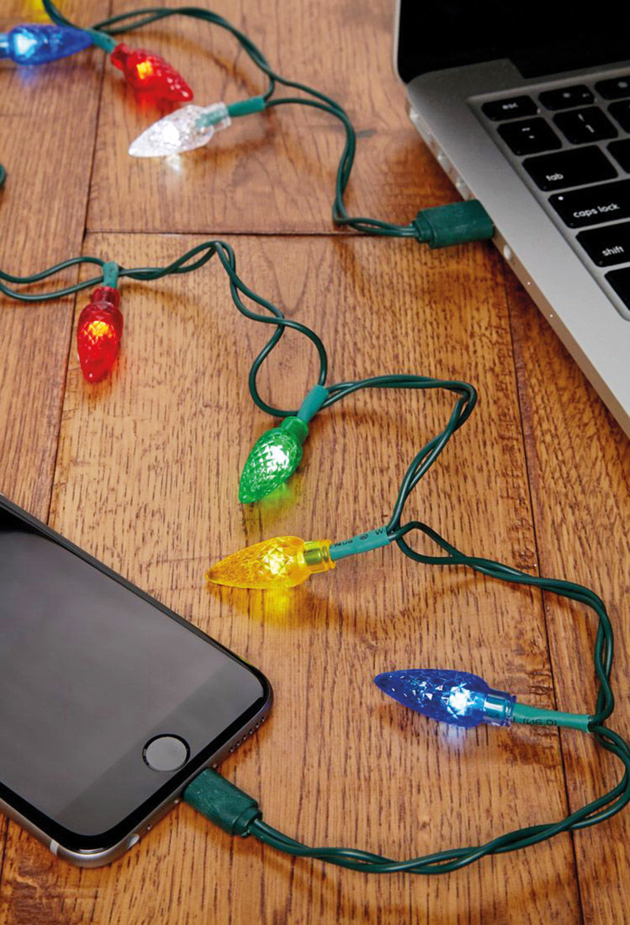 Predpraznično okraševanje pripomore k manj turobnemu vzdušju, ki ga s sabo prinašajo zima in krajši dnevi, prav tako prižiganje prazničnih lučk, ki dokazano izboljšujejo razpoloženje. Končno tudi vaš telefon lahko služi kot drevesce, ki ga nosite s seboj! Letošnja najbolj vroča krasilna novost je namreč polnilec za telefon z božičnimi oziroma novoletnimi okrasnimi lučkami. Dobrih sto dvajset centimetrov dolg zelen kabel je posejan z desetimi miniaturnimi LED-žarnicami različnih barv, ki zažarijo, ko telefon s kablom prek USB-vhoda povežemo z računalnikom ali kadar ga prek priključka polnimo v avtomobilu. Na voljo je tako v različici za iPhone kot za androide, tablične računalnike, GPS-naprave, fotoaparate, zvočnike, MP3--predvajalnike, z raznobarvnimi lučkami v obliki žarnic ali smrečic ali s prosojnimi svetlečimi snežinkami. In čeprav je božični polnilec res namenjen samo polnjenju ter prek njega ne moremo prenašati podatkov, zna biti, da bo kar ostal v uporabi in razveseljeval vse okoli sebe tudi, ko bodo drugi praznični okraski že zdavnaj pospravljeni.