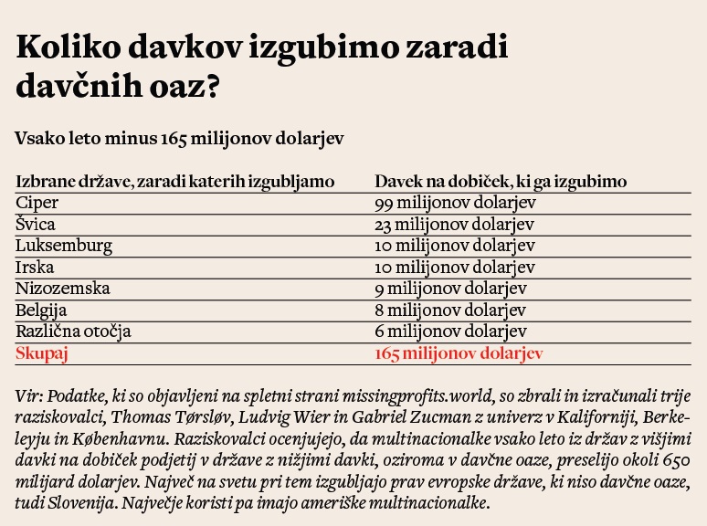 Po izračunu evropskega parlamenta iz leta 2015 naj bi države EU zaradi davčnih oaz vsako leto izgubile od 50 do 160 milijard evrov davkov. Slovenija pa na podlagi raziskave, ki so jo nedavno naredili ekonomisti Thomas Tørsløv, Ludvig Wier in Gabriel Zucman, izgubi več kot 165 milijonov dolarjev na leto. Največ, 99 milijonov dolarjev, seveda na račun Cipra, ki je med mnogimi slovenskimi podjetniki eno najljubših pribežališč. Na drugem mestu je Švica, zaradi katere naj bi bil slovenski proračun letno prikrajšan za 23 milijonov evrov, temu sledita Luksemburg in Irska, kjer Slovenija skupaj izgubi 20 milijonov evrov, in potem še Nizozemska, Belgija ter različne otoške države, kot so Bermudi.